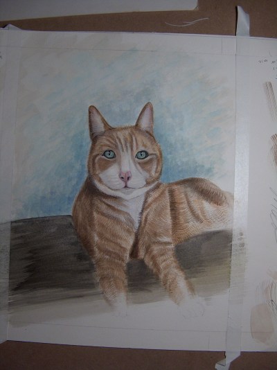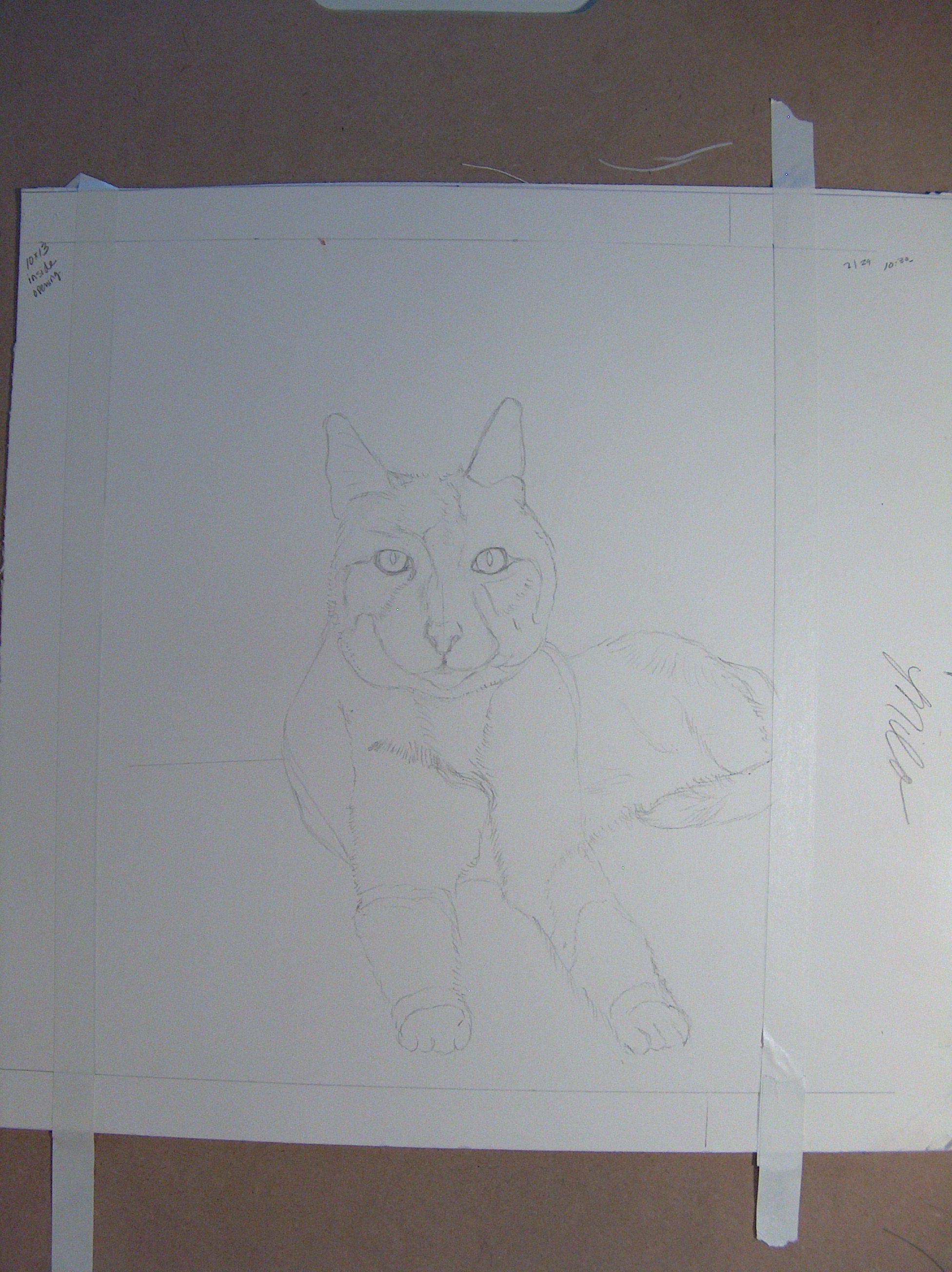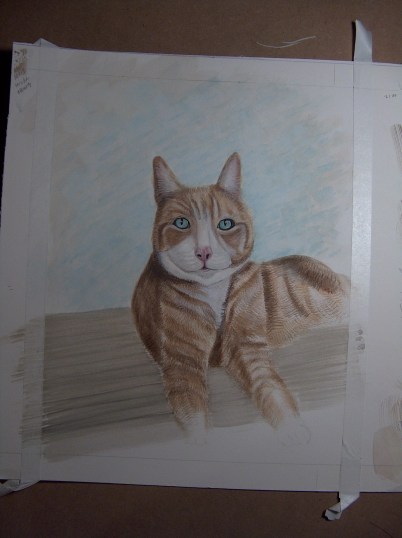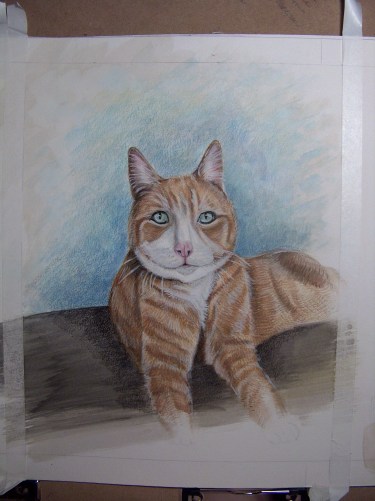 I am not 100% sure on the background as yet. I am keeping the background simple, portrait like. In the artist tip section I have a fact about using tape to mark off the drawing section, in this picture you can see the tape. Plus when the artwork is finished and the tape is removed it leaves a nice crisp professional edge. I am thinking about an oval matt for this old kitty that has a few features that come with age. Kitty winkles!