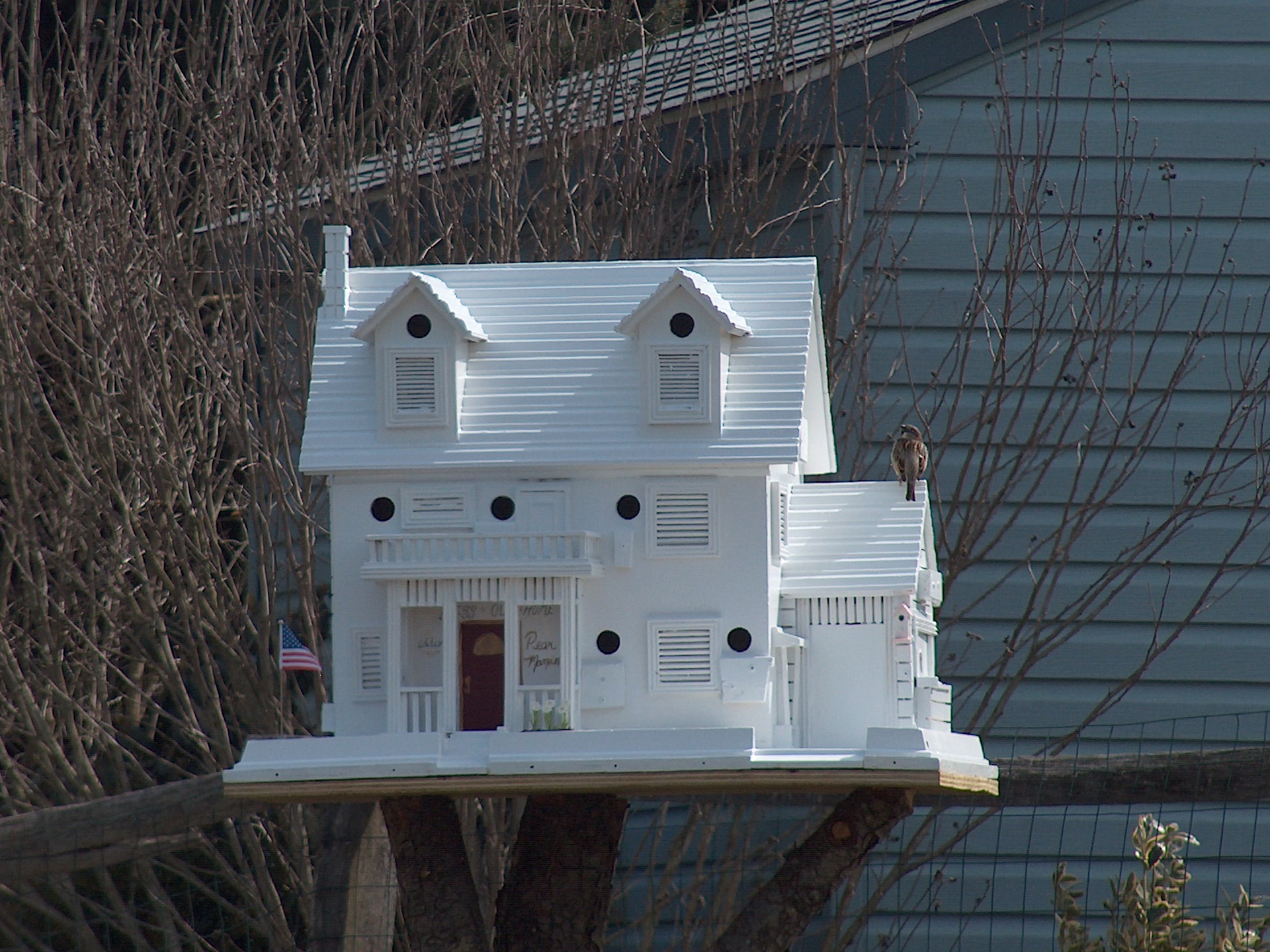 Looking through my kitchen window everyday I get a chance to look at this beautiful once discarded dollhouse turned into a birdhouse estate named Pear Mansion. I found this dollhouse on the garbage in a nice neighborhood. When I seen it I knew it would make a fabulous birdhouse. All I needed to do was divide the compartments, put the holes and paint etc. The pear tree in the backyard had died and needed to be cut down, but the tree certainly made a wonderful post! Within the hour the birds were checking it out! There are now two families living in the garage; there are two holes/compartments and one family on the other side.