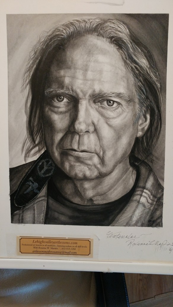 Water color of Neil Young. 14 x 18″. I like it, but see several mistakes. I redrew it….so one day I may repaint it. I went to his concert this past July..three feet from him. He would not take it. Image Reply