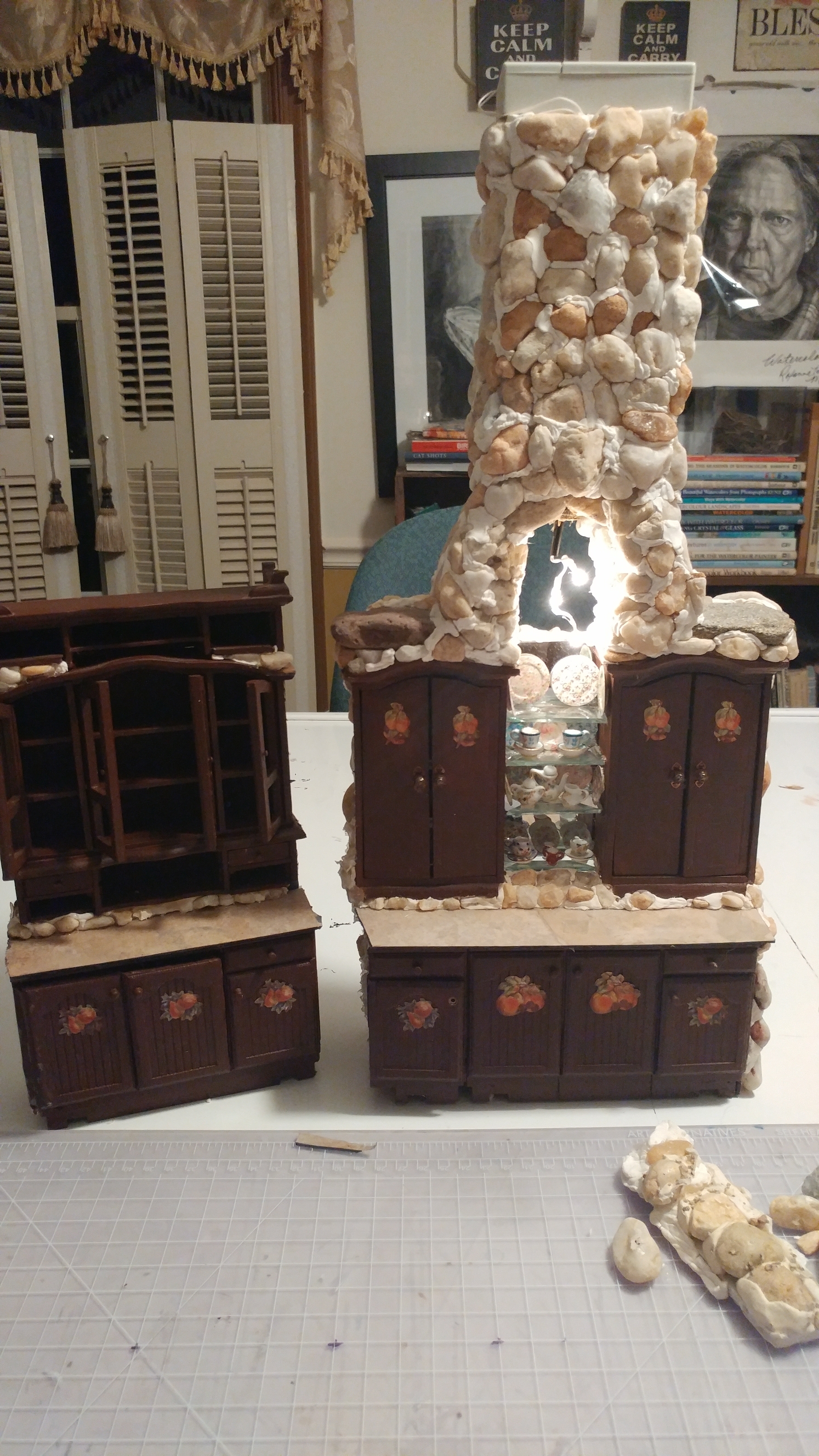 Started working on my dollhouse. Two of my sons put it from my art studio to an empty bedroom now. What a job packing and unpacking! These two pieces were connected, but I just took them apart. They need tlc, which I plan on starting. I had the kitchen at one point almost finished, in order to put it where I wanted two feet had to be cut off the table. A total redo is necessary for the marble stairs and kitchen.