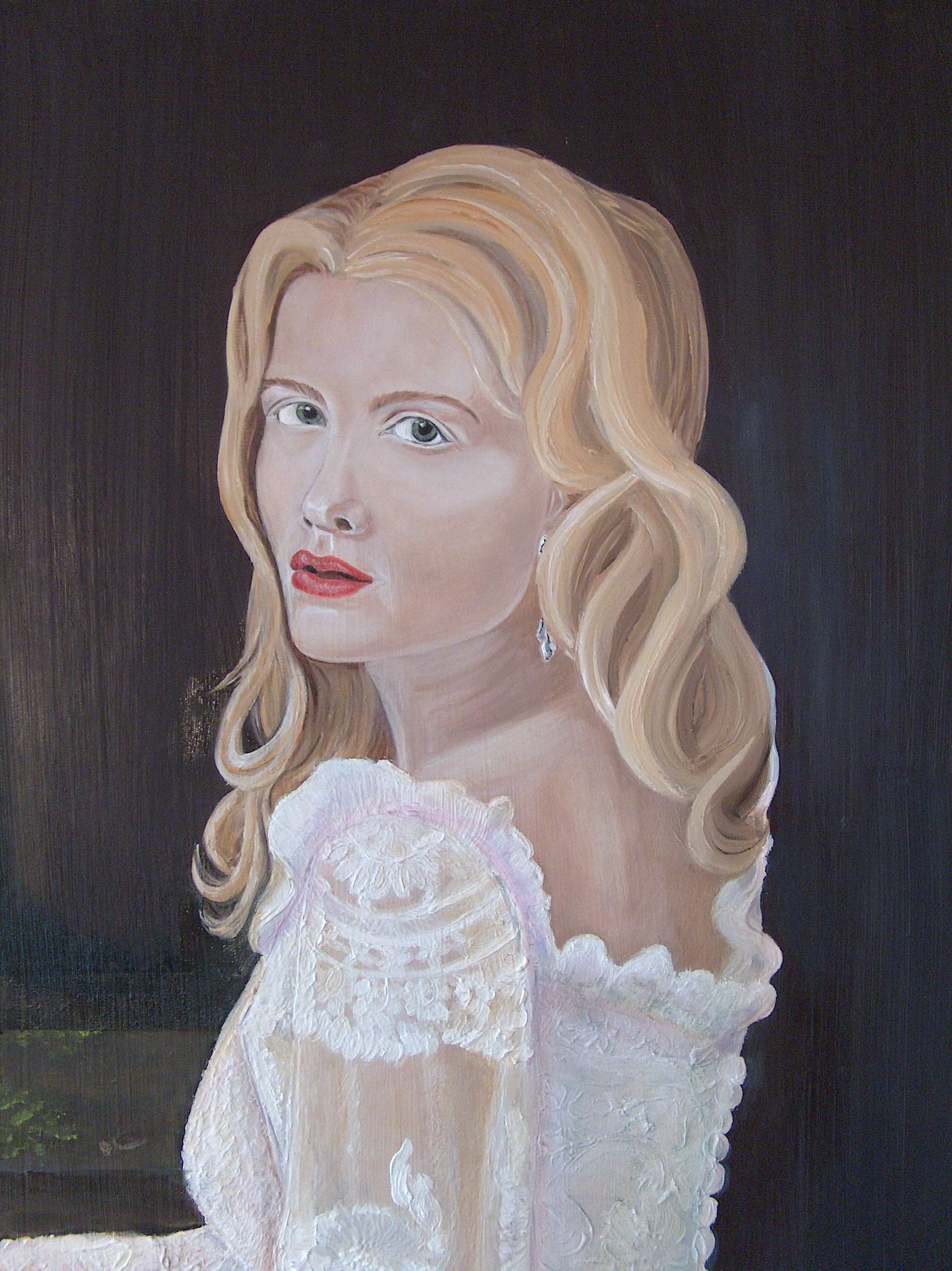 I painted to this point. There are several areas if not all areas that need attention. At this point of realism I need to set the weight of the object or person, correct perspective, and form first before I fine tune the details. I like it so far. The think next I will paint the hands and letter in and then regroup, reevaluate and then details. The background will be damask in contrast eventually.