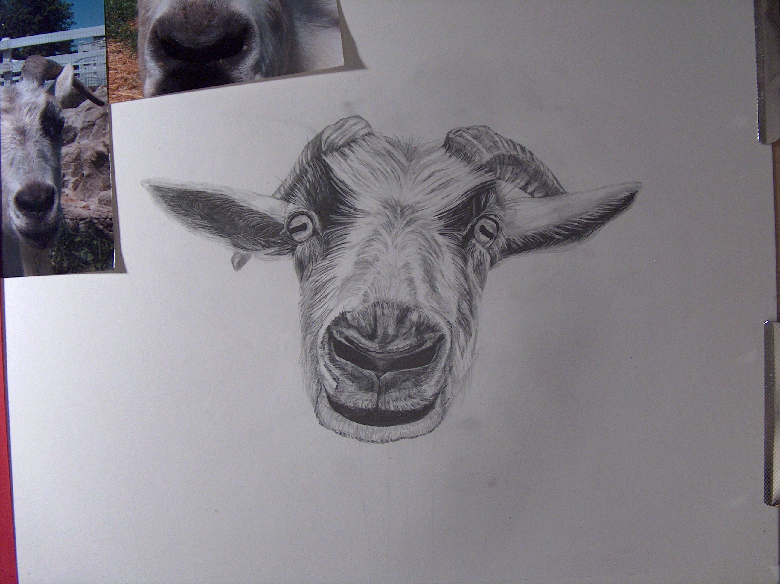 Here is the progression of Elvis the goat in graphite pencils; 4H {warm tone}, 4B {cool tone} and a HB Neutral tone. Notice how I only have an outline sketched and not set in stone. When you have trouble sketching a form out start with one shape such as an eye. Work from one eye out, therefore allowing it to be easy to erase an outside form lines. If you try to draw the outside lines first and then go back and “TRY TO FIT” in the eyes in later in an open space it will not work unless you have Mastered drawing and realism drawing. Work from one form such as an eye and work from the eye and outward.
