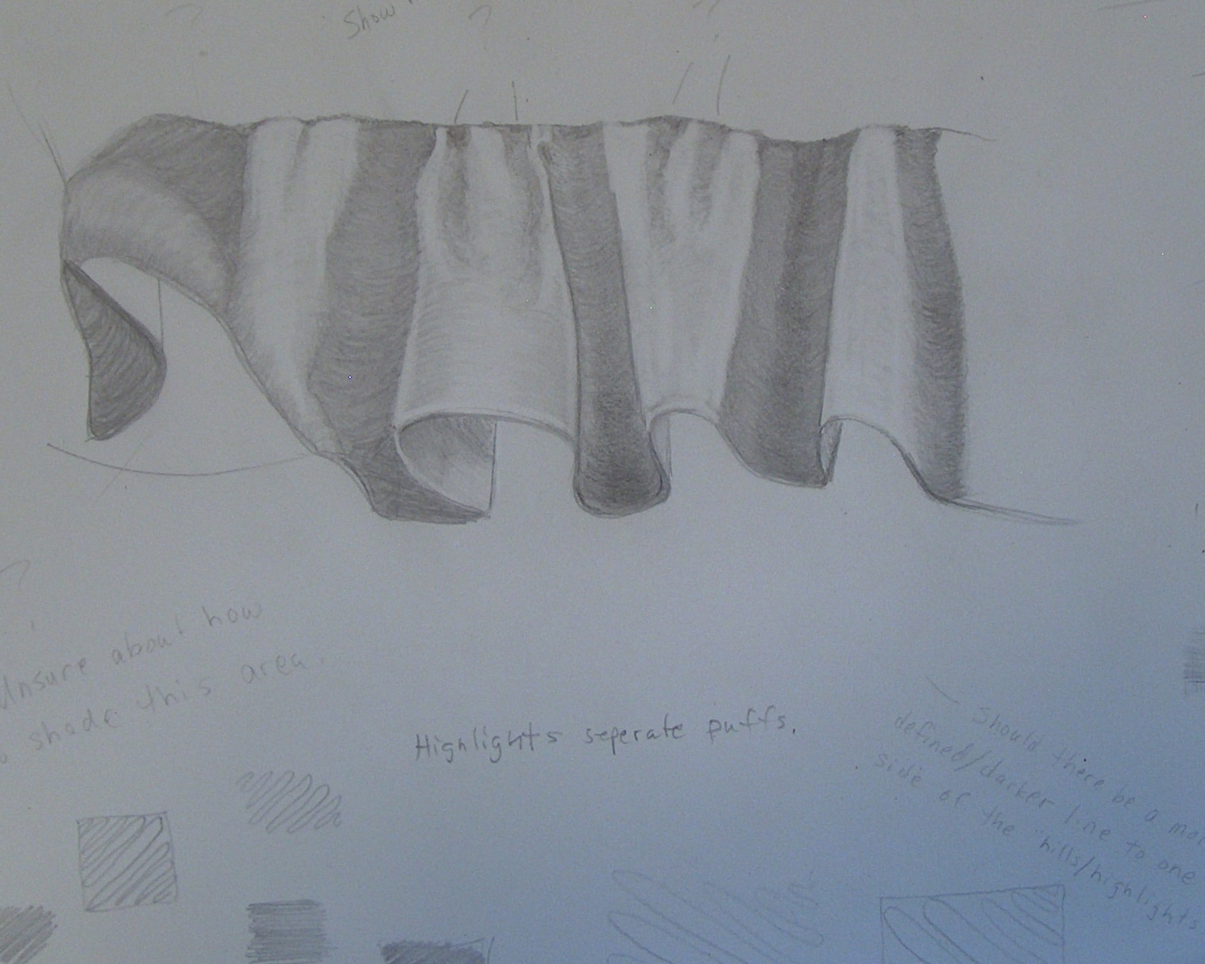 Notice the curves of the folds or known to my students as Hills and Valleys. Top of hills are light where the valleys are darker in value. Remember the value scale and gradual transition of value in scales. Look at the value scale for one to ten values.