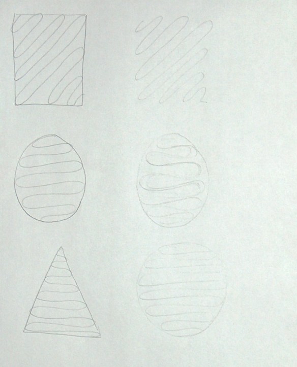 In the exercises below what you want to do is first draw a square, rec-tangle and draw a wiggle line hitting the corners. After a few try to draw the same line without a box. Try the others shapes as well. This teaches your hand and eye control of the pencil pressure applied and teaches your fingers to move, not the wrist. This will help you with control of shading values and gentle gradations of value ranges.
