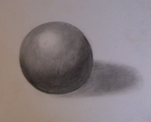 If you think you do not need them….then your wrong. You need a strong foundation of principles. Once you master these principles on all the elements your work will come more easily to you. Plus, a Life drawing class is the strongest foundation you can start with. You will learn to see all the elements with out too much pressure when working on a composition. When you are working on a drawing or any artwork you want the artistic magic to flow and it will with a strong foundation. Trust me on this. I am sure you have seen still life set-ups with circular shapes, sphere, cylinder, and cone shapes? These still life are to teach you basic shapes that can relate to all things found in the natural. This teaches you the elements and how to draw them, but how to see the changing light on one object and how they affect each other in light. The following pictures may help you understand what I am saying when I say elements. One picture is from a drawing book [ Drawing the creative process by Seymour Simmons III and Winer] the sphere is one of mine from college. These are great drawing exercises to practice.