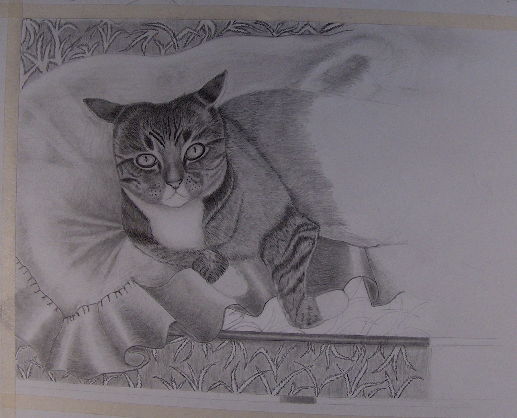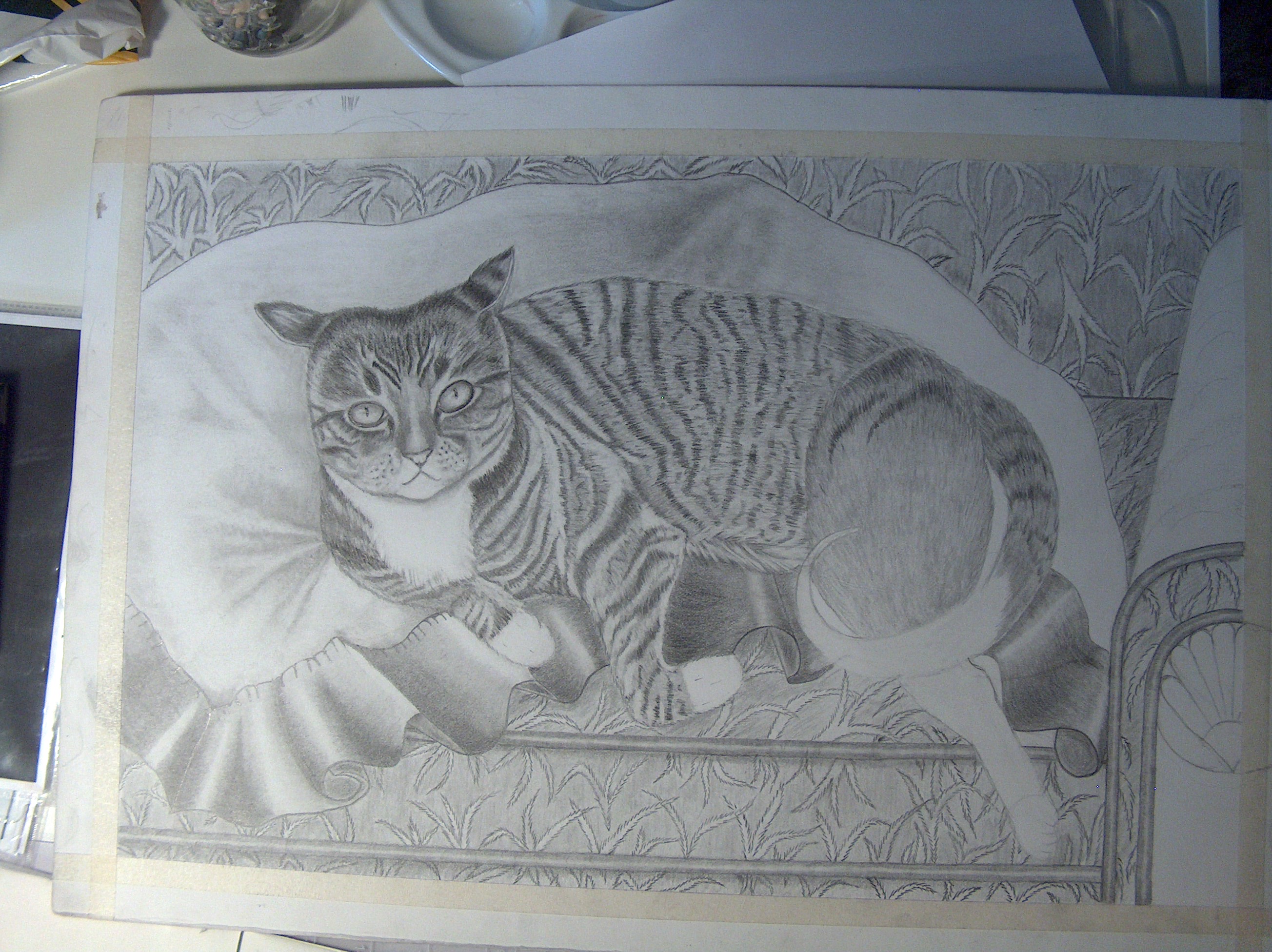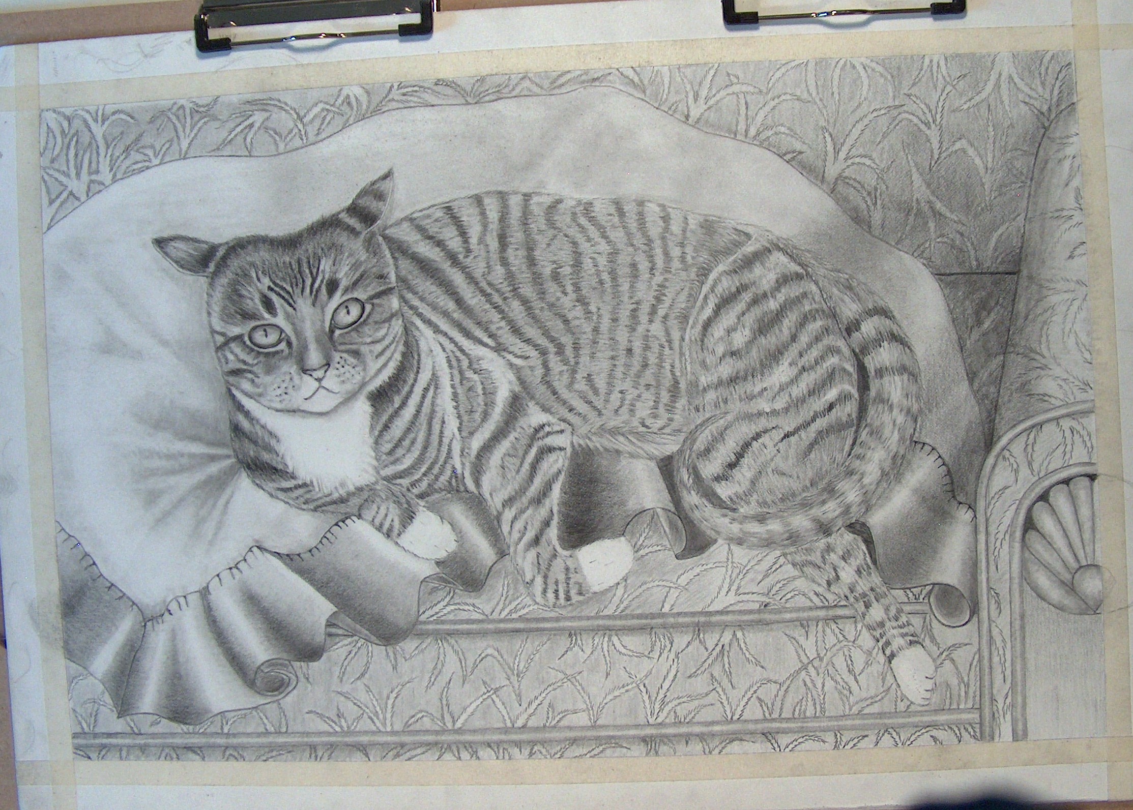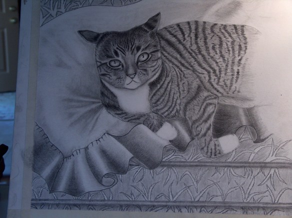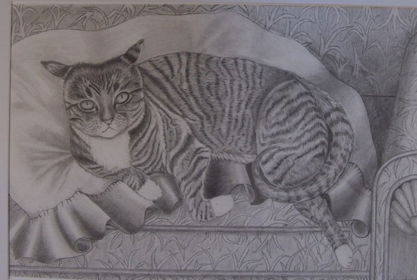 If you would like Joan to consider drawing your cat in graphite you can contact her here and I will relay the message. This Ms. Belle completed in graphite. This has great composition. Joan is going to it framed.
