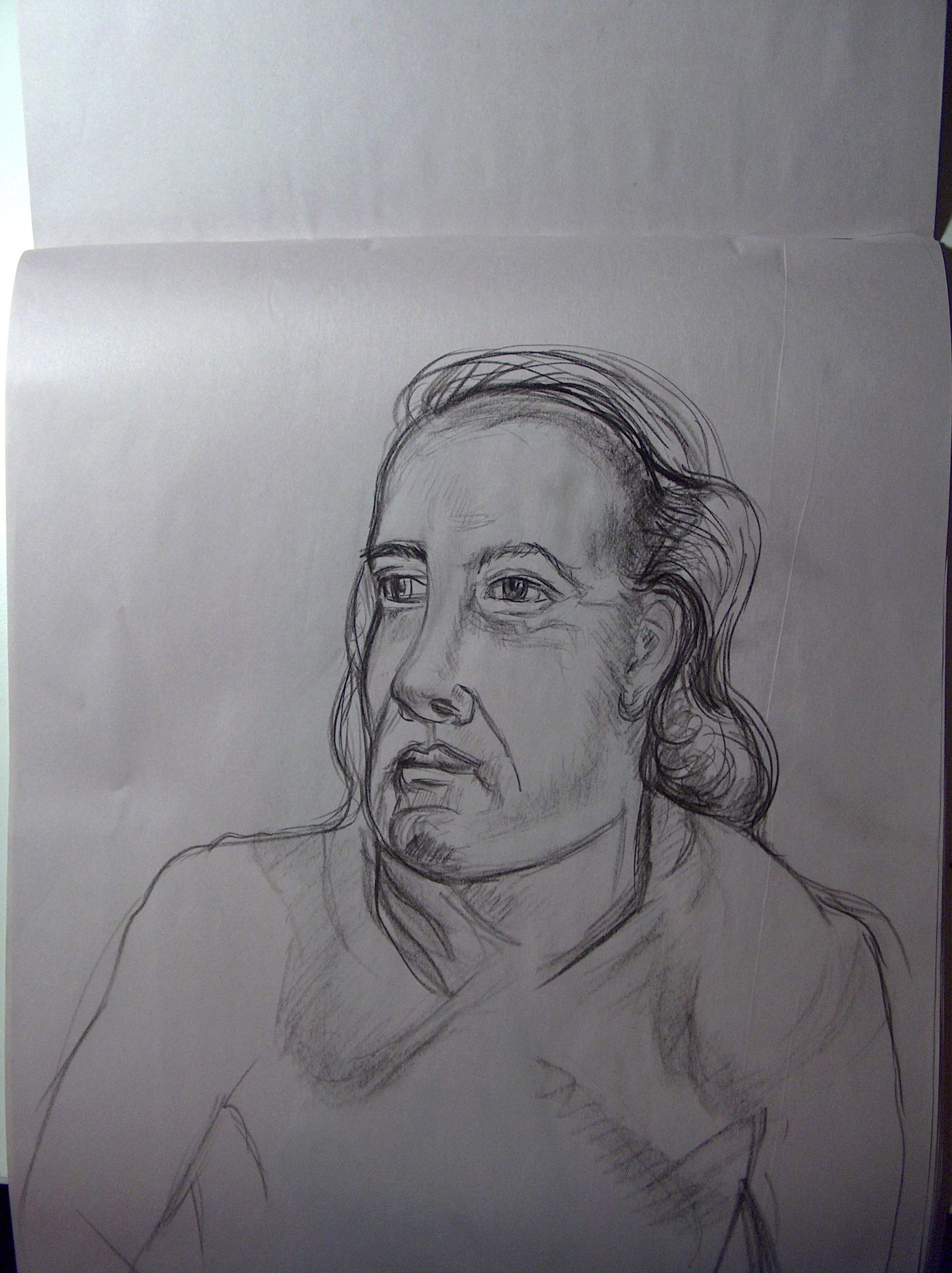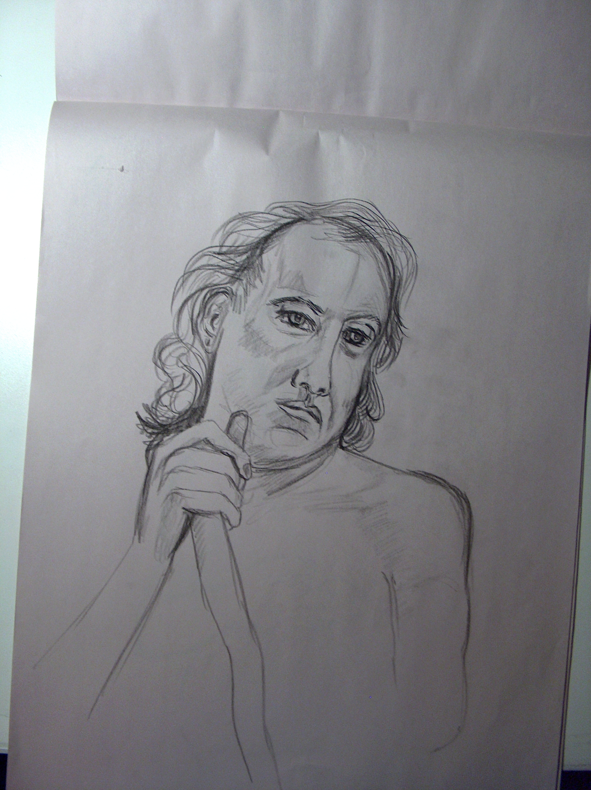 This is Strathmore cold press artist paper most likely to use with pastels. I enjoy working on this embossed cold press paper which has a surface or texture mimicking a golf ball divots. Look closely at the dotty result from the paper’s texture. At first, when sketching it is tempting to toss the sketch into the garbage! It is not similar to drawing on newsprint, the texture doesn’t allow detail at first. Continue to work the sketch for the first 10 minutes or so. Here I used vine [soft] and compressed charcoal [hard] which allowed the shadows [in vine] to smear brilliantly. Still needs to be cleaned up and worked a bit more. The nose is a little too long, but I can’t change that now. This is still a good work sketch with a good likeness, so until he models for the class again this was a good practice.