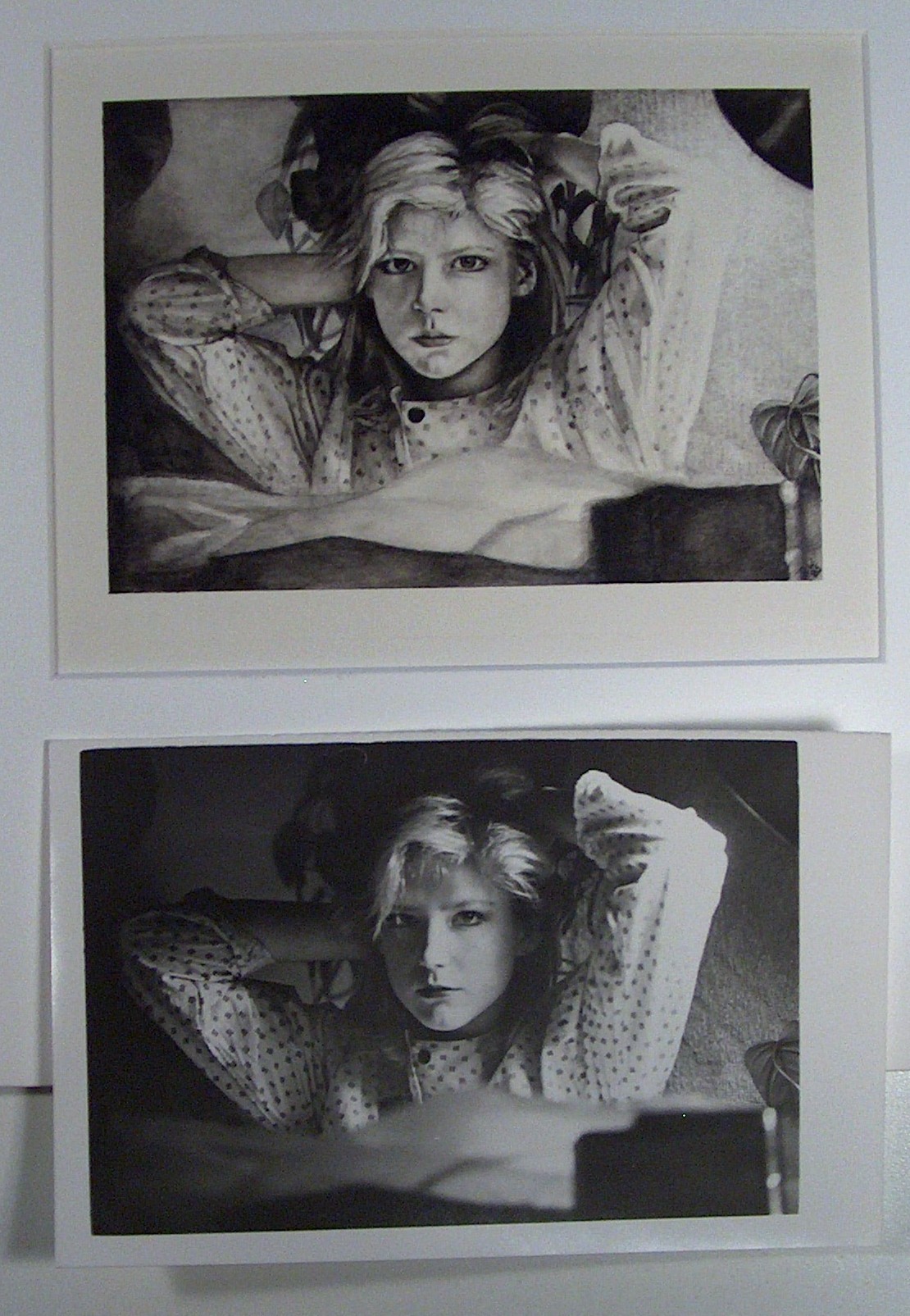 It has been very interesting looking through negatives from college and exploring my mindset then and the pictures I chose to print at that time. On the same token,  after life experiences [and still standing] I still see a connection after all these years.  Now the bridging begins from that part of my work until now. After all these years I like the foundation I can work from. I love this one.This watercolor below was my first wc in portraiture. At this point I had painted fire hydrants and a few landscapes, I have the fire hydrant story written somewhere on the blog. Right beneath the painting is the photograph I used from photo class [My picture]. Never try to use someone elses work to work from especially in realism unless you have permission.Before I title any piece I need to look at all the pieces in a series. @ Chuck I have no idea what happened with the cool/warm tones? Maybe this could be named “Emotion”.