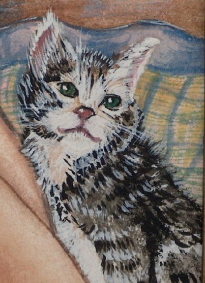 This is a very tiny kitten apart of a painting. The kitten measures about .5″ if that.
